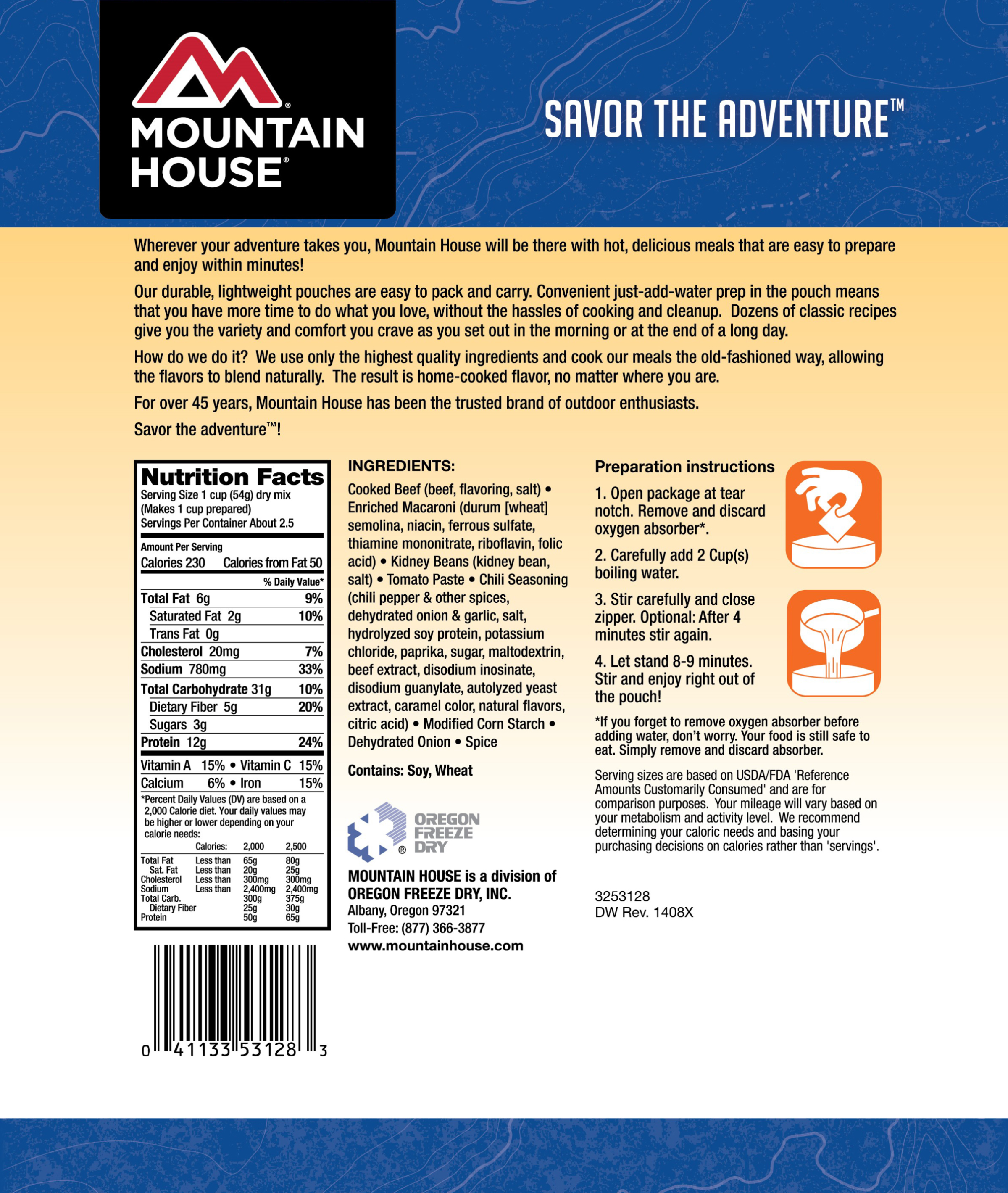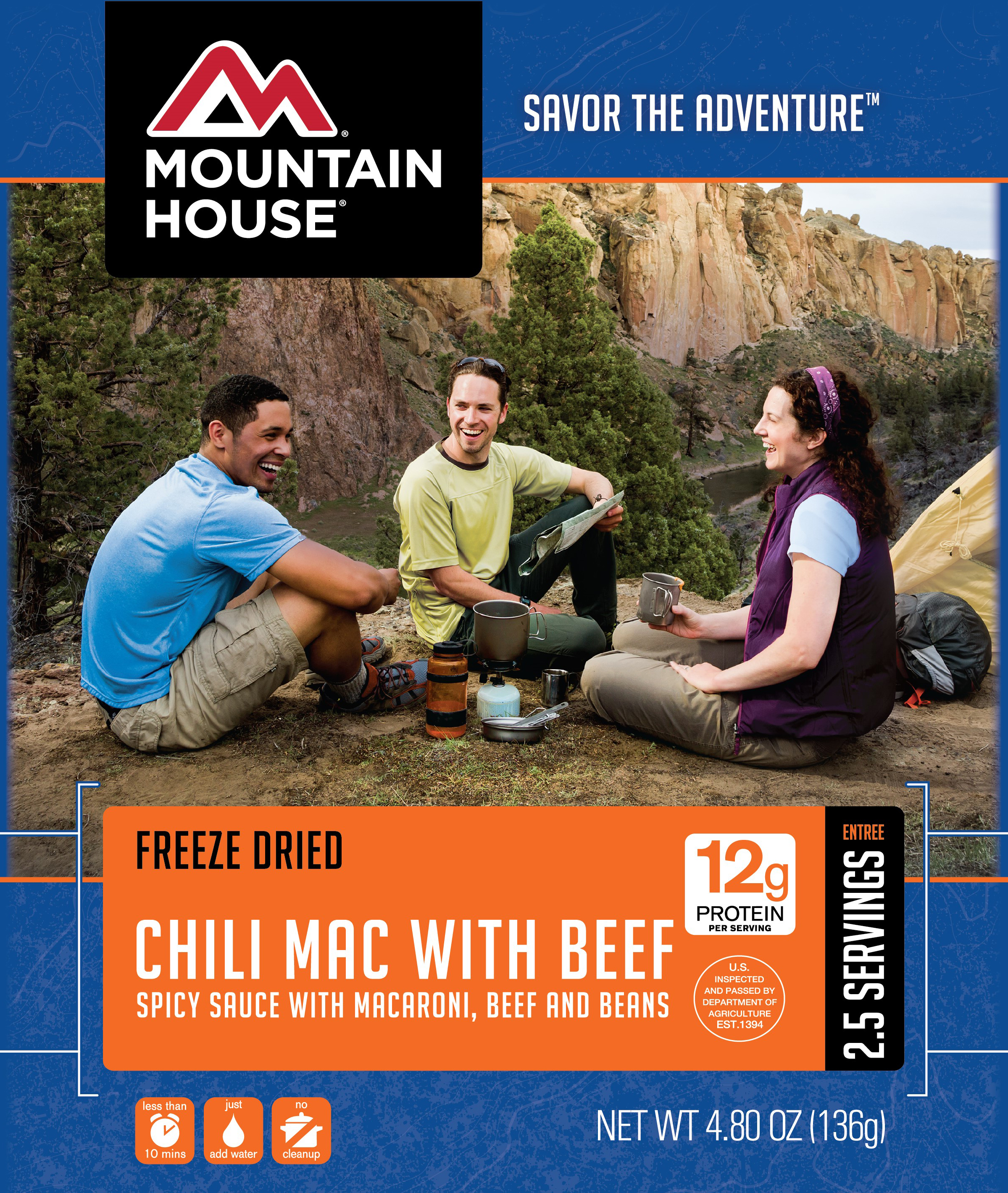 Authentic chili flavor with real beef and macaroni. Weve added a kick of spice thatll wake up your taste buds. Made with real beef, macaroni noodles, and beans. Great for camping, hunting and backpacking. Simple and easy to make, just add water and in 8-10 minutes youll have a hot, hearty meal you can enjoy anywhere.