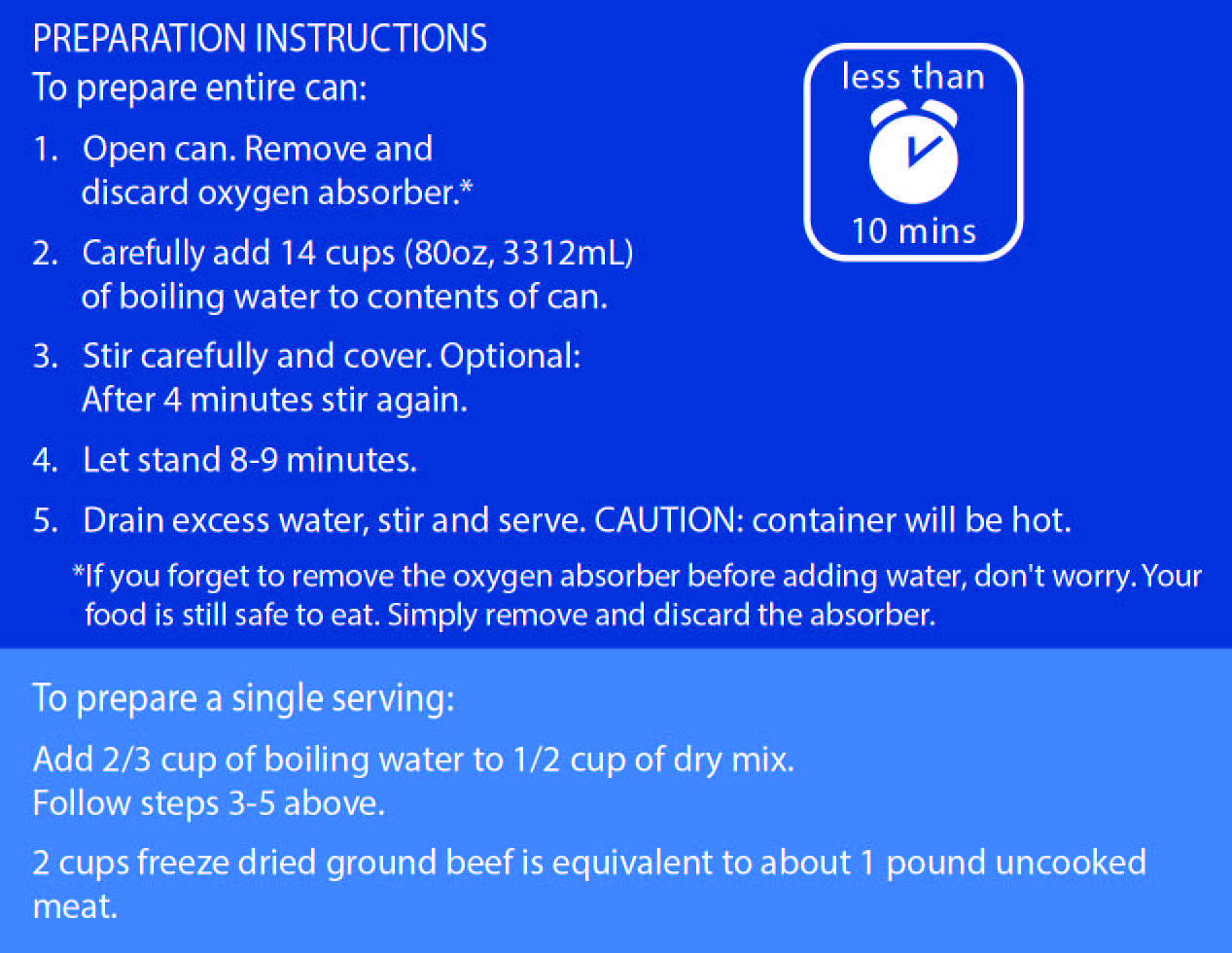 Emergencies can come in many forms. Sometimes it involves a power outage and sometimes its unexpected guests. Either way, weve got you covered. Simply add hot water, and in about 8-10 minutes youll have a delicious meal that will feed the whole family! Made with all natural beef, it is an excellent source of protein that can be used creatively when making your favorite recipes from beef like tacos, chili, or sloppy Joes.