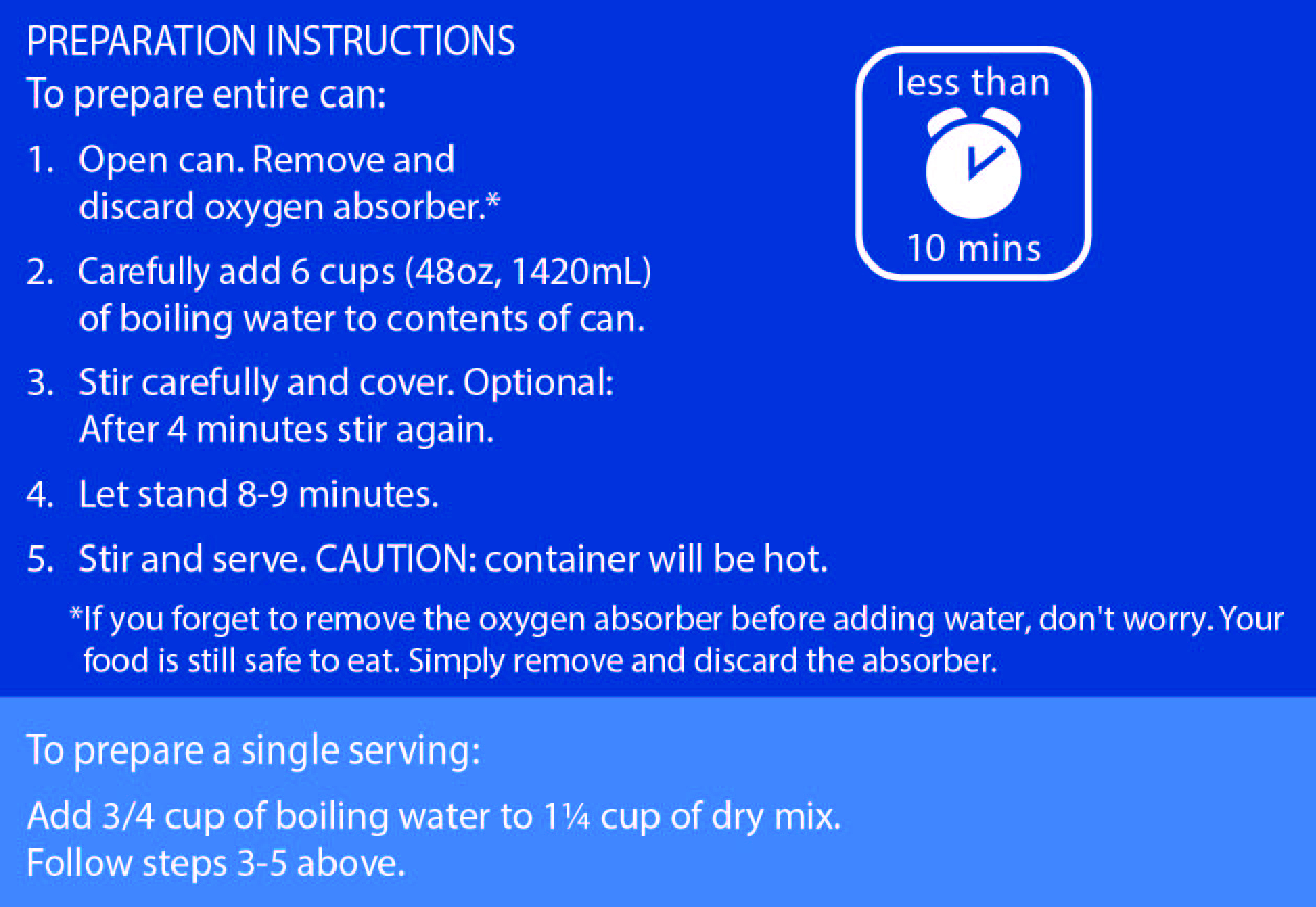 We’ve made food preparation easier. Simply add hot water and in about 8-10 minutes you’ll have a delicious meal you can eat anywhere
