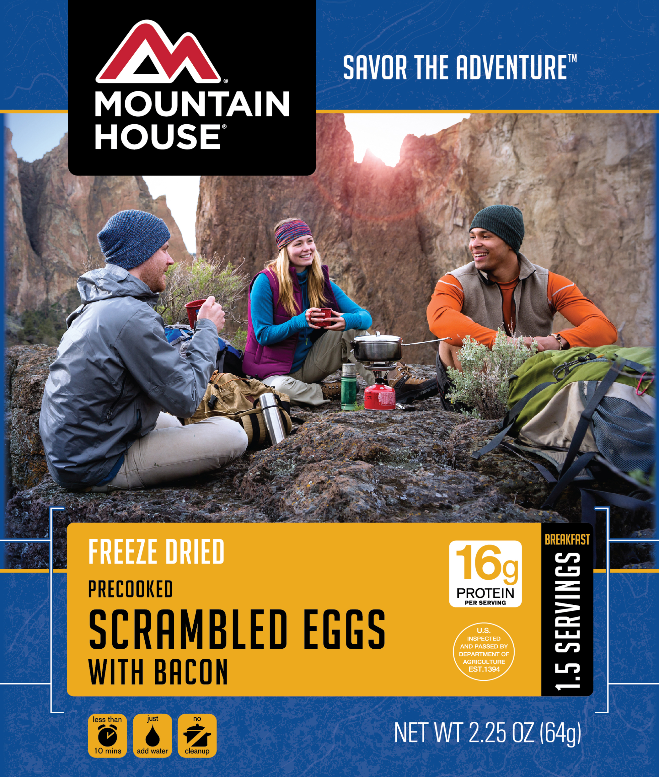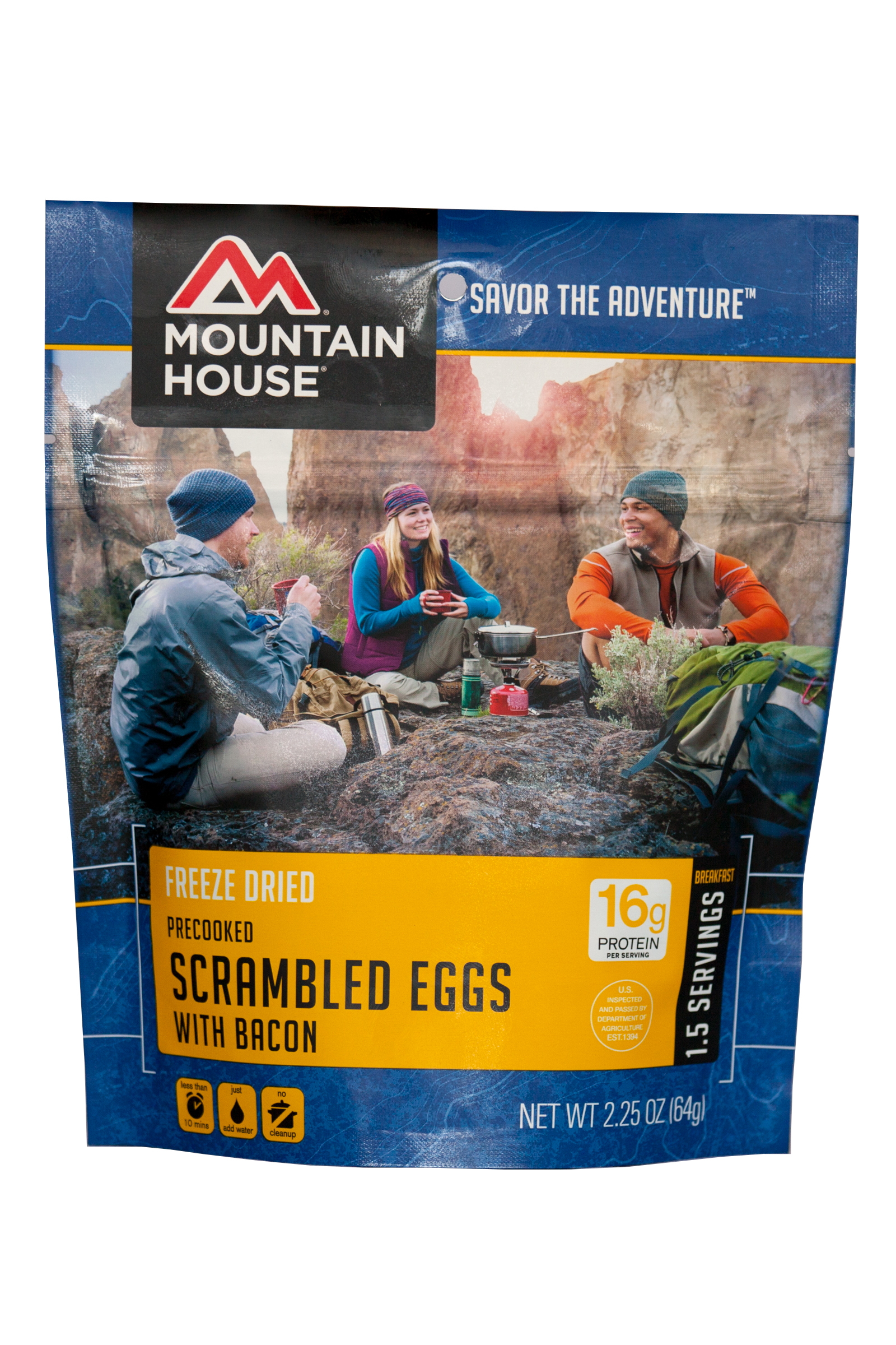 This is way easier than packing in eggs on your next backpacking trip. Way easier to clean up too! All you need to make these tasty scrambled eggs with bacon is add hot water and in a few minutes youll have breakfast you can eat right out of the pouch.